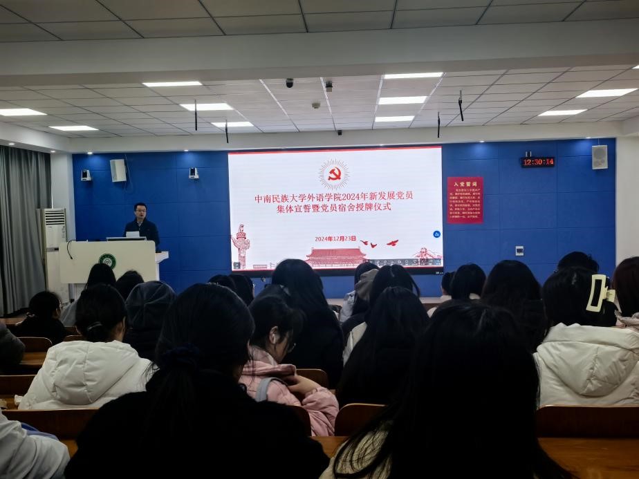 为增强学生党员的责任意识和使命感,进一步发挥党员先锋模范作用,12月23日,学院在10-305教室隆重举行新发展党员集体宣誓暨党员宿舍挂牌仪式。学院党委书记李春雷,党委副书记姬扬,学工办副主任王斌,各年级辅导员、学生党支部书记以及本科生和研究生新发展党员共同参加此次仪式。仪式由王斌主持。