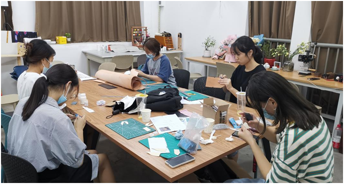 工作室自创建以来,先后完善了工作室环境及硬件设备,规范了工作室管理制度,制作工作室人员信息墙。每学期工作室召开一次计划会,讨论本学期计划,确定阶段工作目标和内容。每学期末召开一次总结会,总结经验成果,梳理问题并共同解决。同时为学生提供皮具制作等手工课程,在满足学生休闲爱好的同时缓解设计参赛的压力。