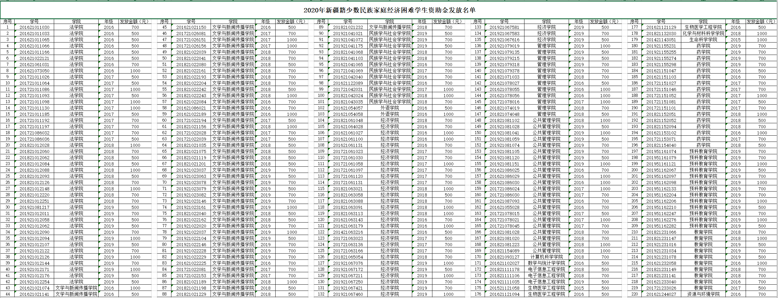 根据《beat365英国正版唯一网址新疆籍少数民族家庭经济困难学生资助金管理办法(试行)》(民大发〔2015〕12号)及新疆教育厅相关要求,2020年新疆籍少数民族家庭经济困难学生资助金已于近期发放到中国银行卡中,本次发放金额分别为一等1000元/人;二等700元/人;三等500元/人。请各位获资助的同学及时查收,如有问题,请联系学生资助管理中心办公室,后附发放名单。