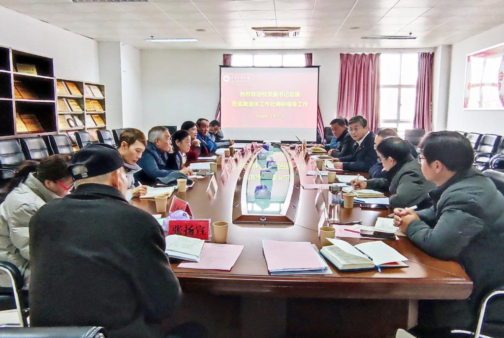 12月17日,校党委书记边境深入离退休工作处调研指导工作,充分了解beat365官网离退休工作情况,听取老同志对学校发展建议。党政办公室主任陈强胜、离退休工作处领导班子成员和退休教职工党支部书记参加调研座谈会。座谈会由党委组织部常务副部长、离退休工作处处长周刚主持。