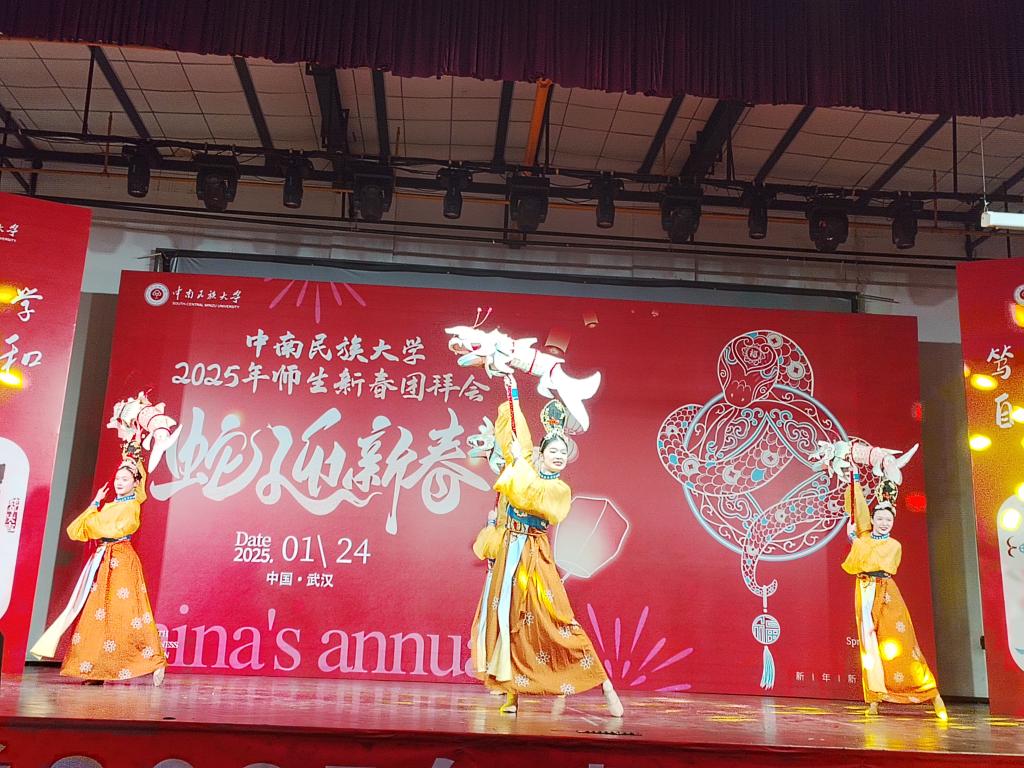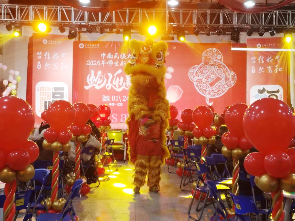刘义为祥狮点睛并致辞。他向留校的同学们、老师们及家属,向寒假期间值守岗位的一线员工,致以节日的问候和新春的祝福。他表示,在刚刚过去的一年,学校深化教育教学改革、推动管理服务创新,着力提升教学质量水平;抢抓机遇、勇于探索,围绕铸牢中华民族共同体意识主线、教书育人主责,打出一套内外结合、协同发展的“组合拳”,各项事业发展都迈出了坚实步伐。希望同学们在学校过一个“暖心年”“幸福年”,把新年的愿望融在共同欢聚的浓浓年味里,一同感受不一样的武汉新年。