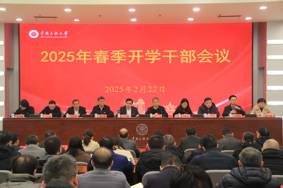 校党委副书记、校长刘义总结了学校2025年寒假期间主要工作,就2025年工作作了重要部署。总体工作思路是:坚持以习近平新时代中国特色社会主义思想为指导,深入学习贯彻党的二十大和二十届二中、三中全会精神,深入贯彻落实全国教育大会精神、全国民族团结进步表彰大会精神,聚焦铸牢中华民族共同体意识主线,全面贯彻落实潘岳同志调研学校讲话精神,锚定“双一流”建设目标,统筹推进“十四五”收官与“十五五”发展衔接,紧紧围绕落实立德树人根本任务,加快推进学校转型升级和内涵式高质量发展,持续提高服务党的民族工作和湖北支点建设的能力水平。重点工作有五个方面:一是坚持学习贯彻习近平新时代中国特色社会主义思想,强化事业发展政治引领与保障;二是坚持聚焦铸牢中华民族共同体意识主线,持续推动学科转型升级;三是坚持落实立德树人根本任务,持续提升育人质量;四是坚持夯实高水平发展基础,持续扩大学校影响力;五是坚持推进内部治理体系和治理能力现代化,持续巩固发展支撑。
