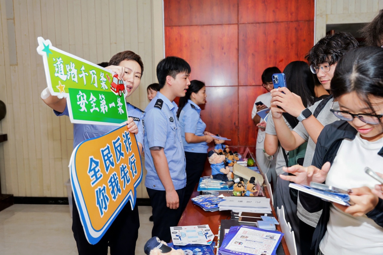 活动正式开始前,学校礼堂外的互动区早已人头攒动。礼堂大厅设置的禁毒、反诈、户政、交通等多个宣传展台前围满了新生。