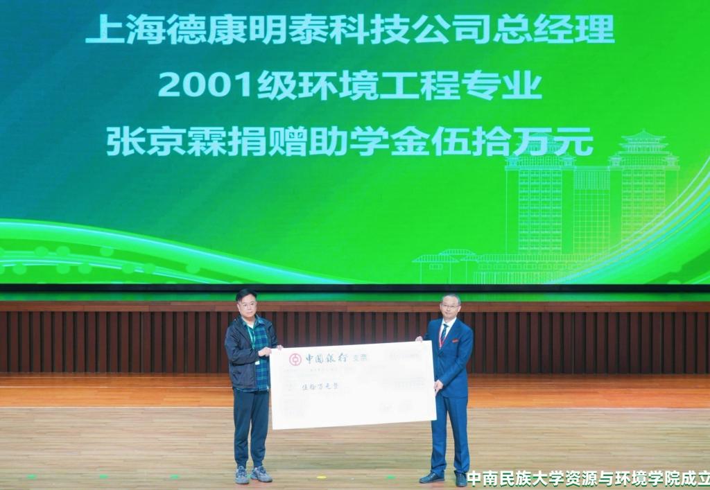 在校友捐赠环节,2001级环境工程专业校友、上海德康明泰科技公司总经理张京霖向学院捐赠50万元助学金,为学院人才培养与事业发展贡献自己的力量。资源与环境学院党委书记刘子元代表学院接受捐赠。