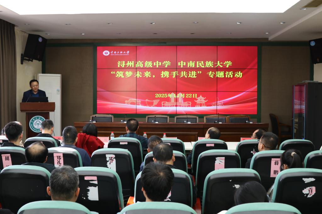 覃瑞在致辞中介绍了学校的办学定位与发展特色。他表示,学校始终以铸牢中华民族共同体意识为主线,落实立德树人根本任务,不断优化人才培养体系,推动教学改革与科研创新协同发展。他期待,双方以此次交流为契机,在招生宣传、人才培养和文化传承等方面深度合作,共同构建资源共享、优势互补的协同育人机制,共同培养更多高素质人才,为地方经济发展和民族团结进步事业做出贡献。