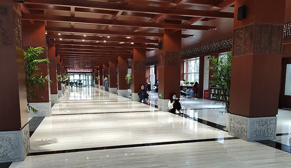 为迎接学子归来,营造更舒适的读书环境,图书馆进行了全面翻修,更新了借书还书的电子设备等,以焕然一新的面貌出现在大家面前。阔别多月的阅览室、自习室书香满溢,安静的室内唯有轻翻书页和奋笔疾书的沙沙声。图书馆大堂长廊内也成为自习的好去处,可随手取阅的书籍,随处可见的高大绿植,蓬蓬软软的蒲团,同学们席地而坐,静静地倚柱默读。