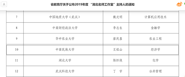 近日,湖北省委组织部、省教育厅公布了2019年度“湖北名师工作室”主持人人员名单,经各地教育部门、各高校遴选推荐,专家评审,社会公示,经济学院教授王祖山成功入选,并获“湖北名师工作室”主持人、“湖北名师”称号。
