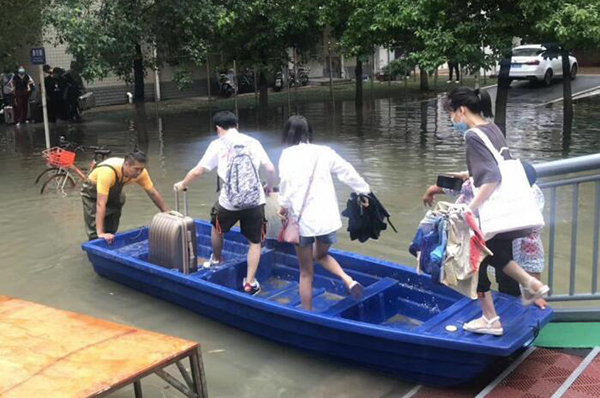 入梅以来,武汉市连日多雨,6月28日至29日上午,普降特大暴雨,毕业生返校路艰难而又温馨。29日,校党委副书记、副校长宋发军和学工部、校团委老师亲往火车站,迎接最后一批返校的毕业生。住北区学生公寓的同学自南区走过天桥,映入眼帘的是一条蓝色的小舟,后勤保障处的师傅挽舟涉水,送他们前往寝室。这是beat365官网防涝抗洪工作的一个缩影。