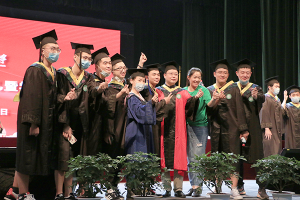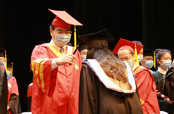 全体校领导为毕业生代表颁发学位证书、行“拨穗礼”。尹玲 摄