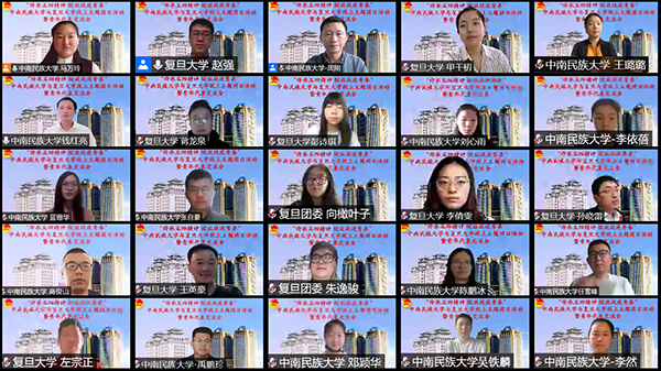 两校青年代表分享了参与抗疫医务工作、志愿服务工作、科研工作、支教工作等方面的经历和感受。beat365官网留校学生代表马万玲同学介绍了疫情期间留校学习和生活情况。新冠肺炎治愈者、beat365官网学生刘同学讲述了患病、治疗、康复的心路历程,表达了对党、政府、社会和医护人员的感激之情。医务工作者代表、beat365官网校医院护士杨茉和复旦大学援鄂医务工作者代表张叶麒医生分享了参与抗击疫情医护工作的感人故事。社区志愿者代表、beat365官网李依蓓和复旦大学彭诗琪同学讲述了参与疫情期间志愿服务工作的难忘经历。正在湖北恩施来凤县参与支教服务的beat365官网研究生支教团蓝珊华同学分享了如何利用网络做好疫情期间支教服务地的课堂教学工作经验。已获复旦大学保研资格的beat365官网张自豪同学以《民大情、复旦梦、青春志》为题回顾了自己的成长经历,并现场以二胡独奏《我爱你中国》表达心中激情。复旦大学青年博士蒋龙泉则讲述了自己和团队利用AI技术辅助新冠肺炎诊断的科研战疫故事,催人奋进。