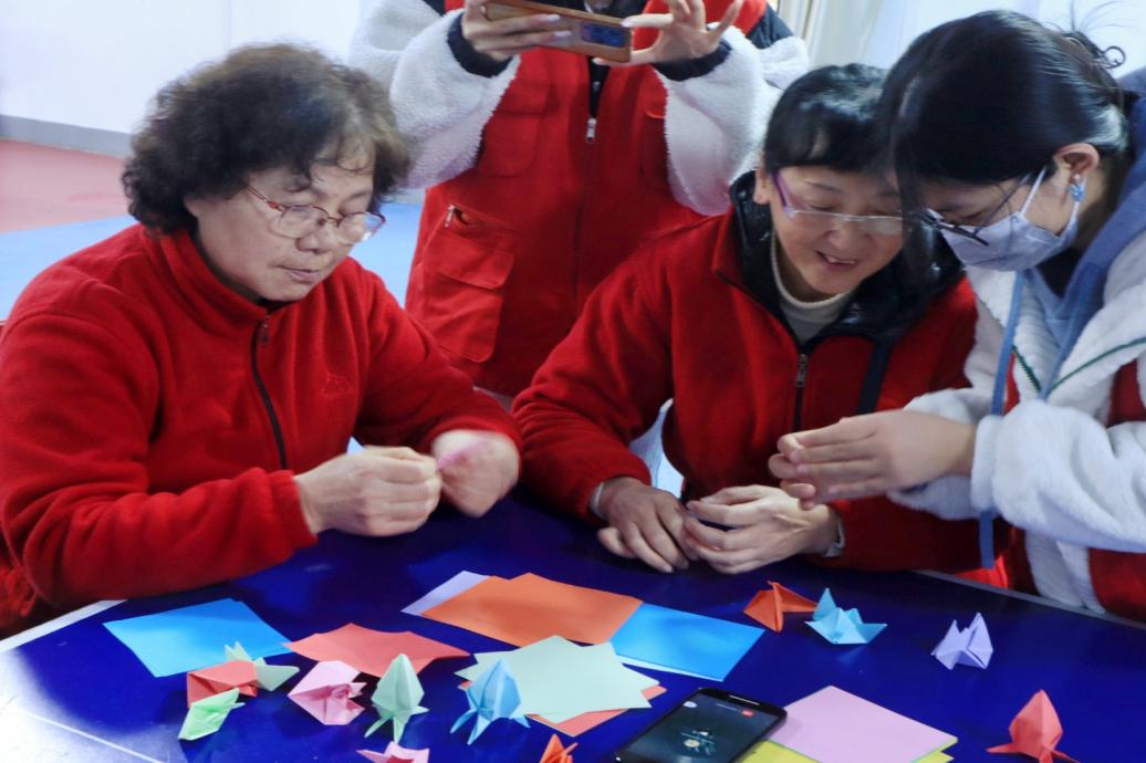 志愿者们教老人们叠千纸鹤。  莫富富摄