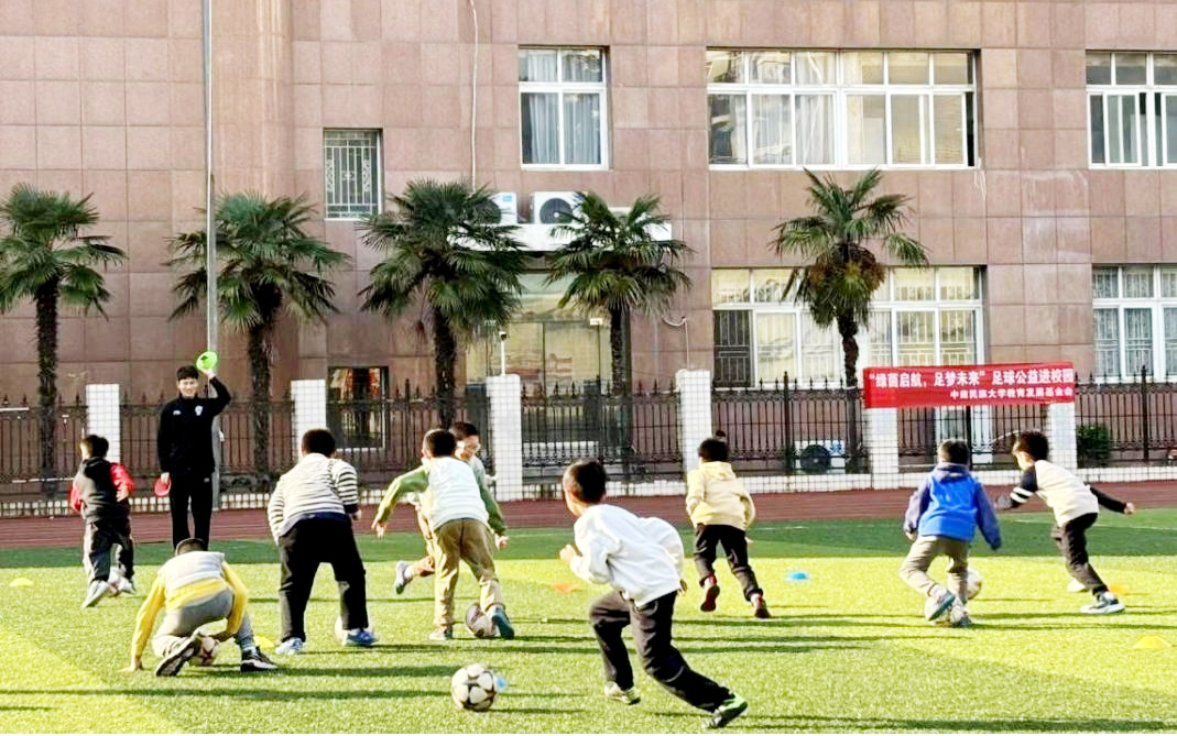 在小学生们迫不及待的热情呼唤下,足球公益进校园活动正式拉开序幕。足球志愿教练们耐心地讲解足球基本技能和比赛规则,认真示范动作细节和训练流程:微微前倾,是带跑动作;身体后仰,是射门动作;身体下蹲,是防守动作……“传球时,脚内侧要这样轻轻推出去,要控制好方向和力道哦!”身材高大的教练半蹲着身子,双手比划着,仔细纠正孩子们的动作,话语温和而有力。他们的热情鼓励和细心指导让孩子们很快就投入到学习状态中来。