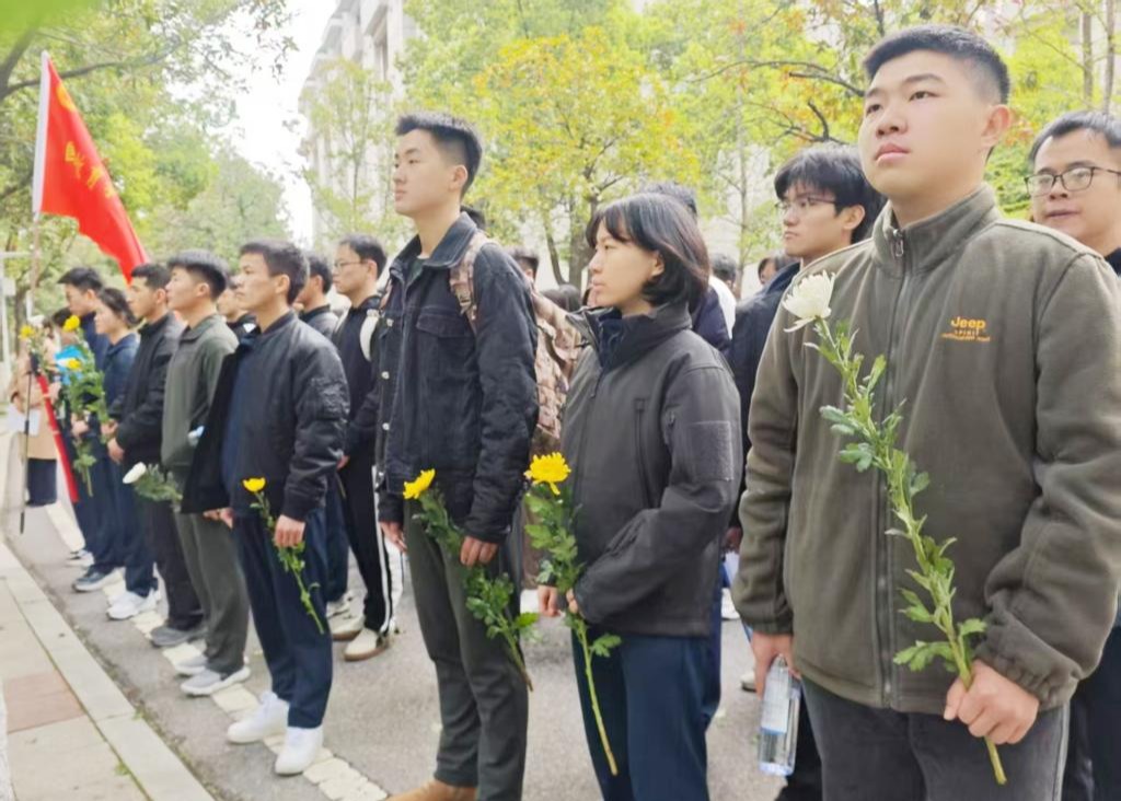 “全体脱帽,默哀!”随着指令下达,同学们集体垂首,静默一分钟。默哀礼毕,同学们依次缓步上前,将手中的菊花轻放在吴泽霖老先生雕像前。数学与统计学学院2023级本科生张韵婷感慨地说:“这是我第一次送花,看着面前层层叠叠的花,内心深受感动。是前辈们的辛勤付出,才有如今的美好生活,我会更加珍惜这来之不易的幸福。”