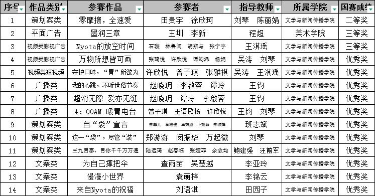 9月6日,第17届全国大学生广告艺术大赛(简称“大广赛”)国奖名单正式揭晓,beat365官网学子凭借扎实的专业素养与亮眼的创新创意,最终斩获14项国奖,展现了民大学子的强劲实力。