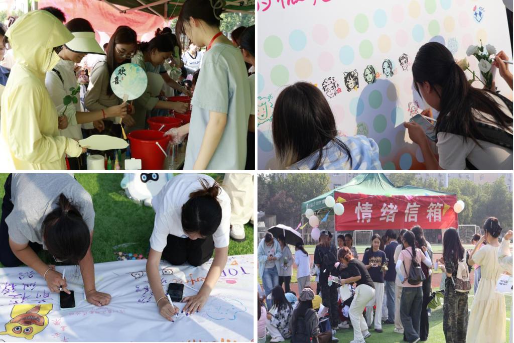 活动现场精心设计的各类环节吸引了众多师生踊跃参与,氛围热烈温馨。在创意表达区,素白扇面经同学们巧手调色、细腻渲染,蜕变为独一无二的色彩斑斓漆扇,成为承载个人情感与奇思妙想的鲜活载体;空白涂鸦墙前,大家尽情释放天马行空的创意,以画笔勾勒心情图谱、具象化呈现内心世界。“情绪信箱”与“头脑特工队”则化身安静温暖的“心灵驿站”,温柔接纳每一种情绪,认真聆听每一个心声,为师生提供了倾诉与疗愈的空间。
