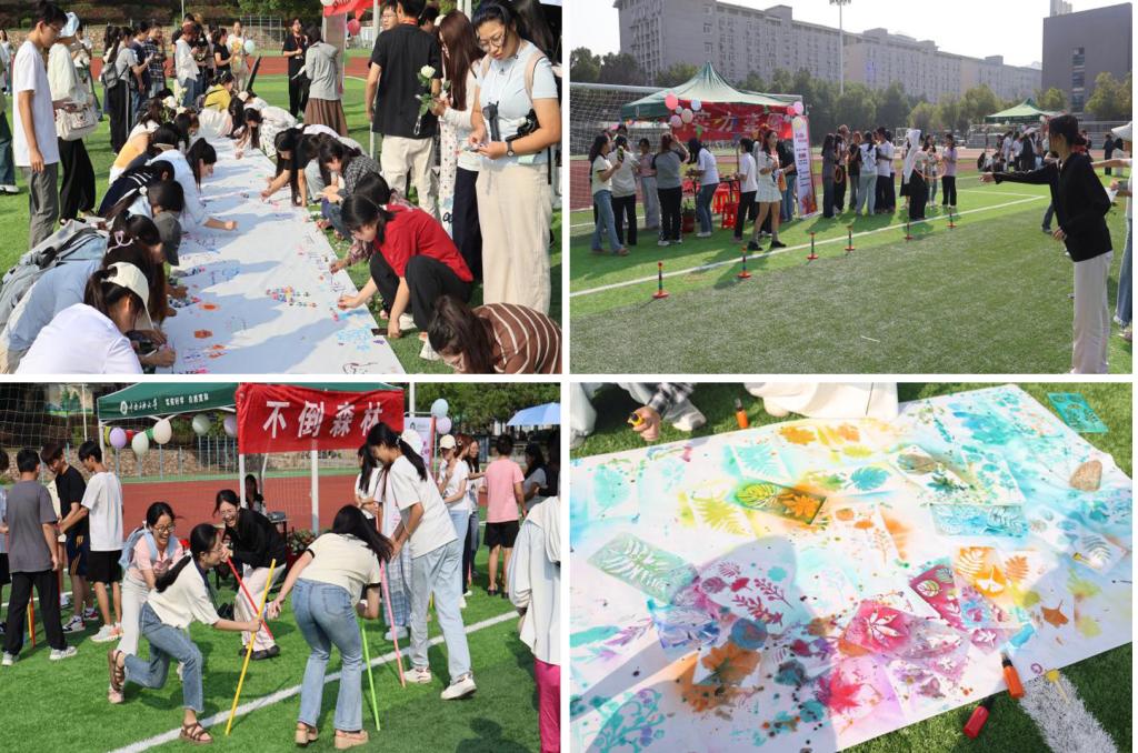 互动协作区则洋溢着蓬勃朝气与团队活力。“不倒森林”项目中,同学们默契配合、彼此扶持,在一次次尝试中深刻体悟团队协作的精神内核;“游戏大闯关”环节人气爆棚,从考验团队协调的“一圈到底”、紧张有趣的“蒙眼弹瓶盖”,到挑战身体协同的“同手同脚”,再到畅快宣泄压力的“扇走烦恼”、充满创造乐趣的“植物喷绘”——每个游戏都让师生在互动中拉近心与心的距离,在协作中真切感受同侪的温暖与力量。