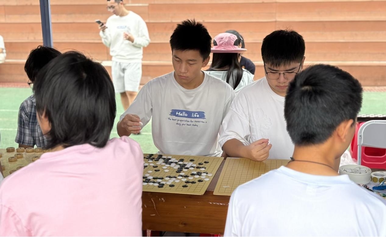 新生与南湖棋社摆台成员对弈中。谢荣摄