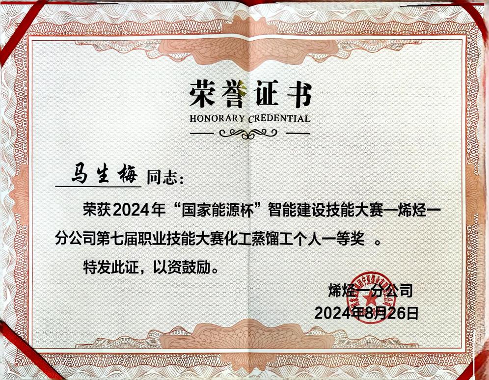 马生梅2024年获化工蒸馏工个人一等奖证书。