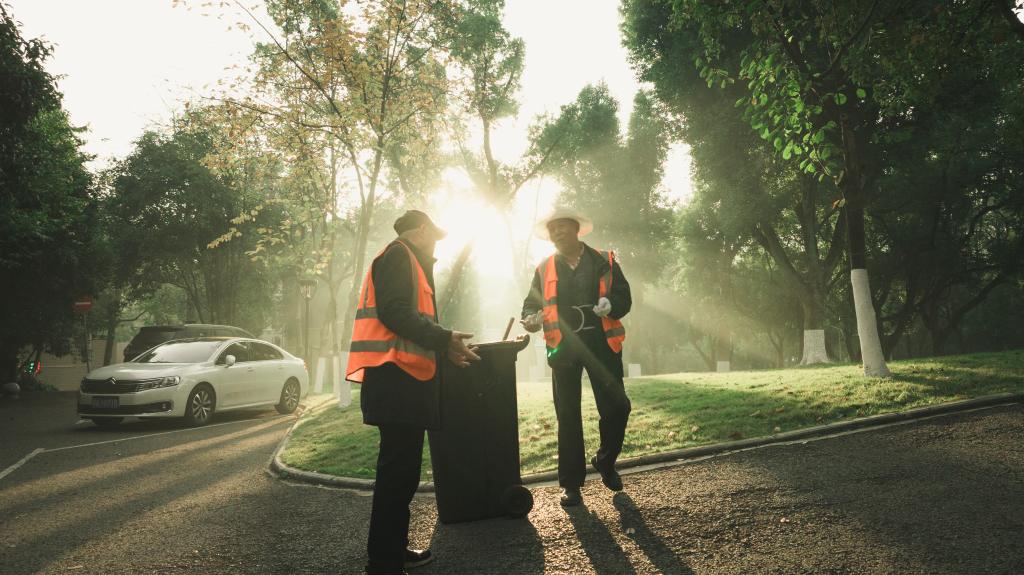 当第一缕晨光穿透薄雾,为秋日花园镀上温暖的鎏金,这幅名为《秋日晨光的守护者》的画卷便悄然展开。两位环卫工人的身影,是晨光中最动人的笔触。他们挥动扫帚,扫起的不仅是落叶,更是冬日宁静的前奏。那沙沙声响,仿佛是季节与季节之间的温柔交代。