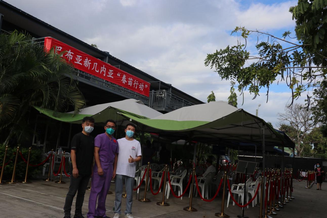 2021年,王志校(右一)在“春苗行动”中担任志愿者,为在巴新华人华侨接种新冠疫苗服务。
