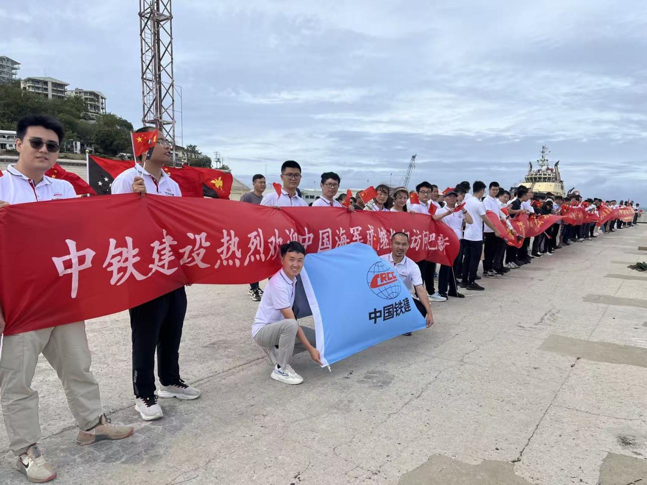 在中国海军戚继光舰访问巴新期间,王志校(前一)组织公司党员到港口迎接,并参与访问保障工作。