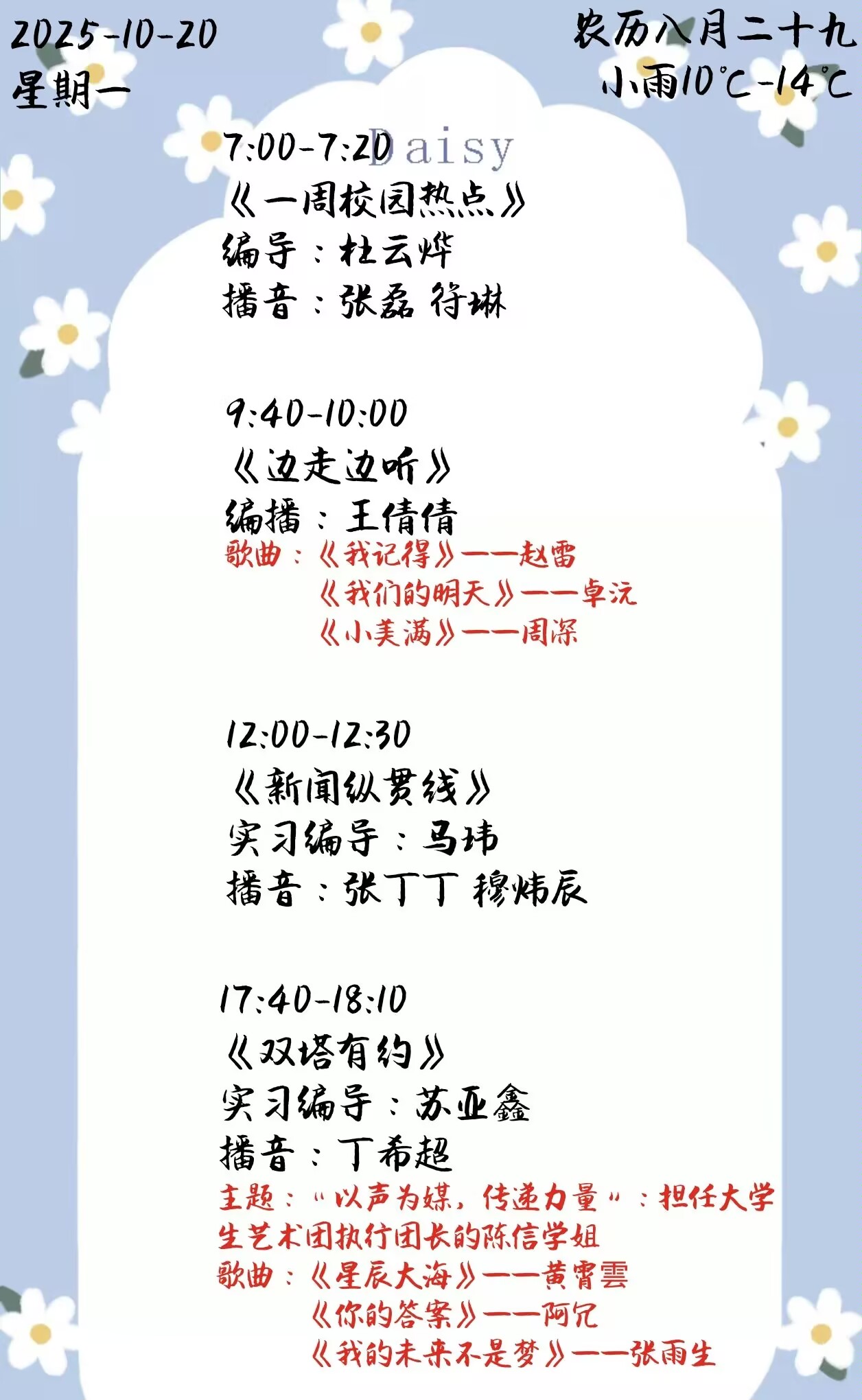 上一篇: 双塔之声2025年第二学期第8周节目单(2025.10.27-10.29)