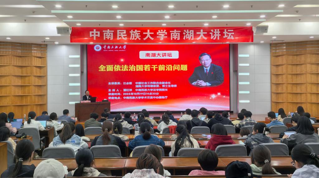 10月19日下午,beat365官网第六十四期南湖大讲坛在学术交流中心举行。本次讲坛邀最高人民法院原党组副书记、副院长,第十三届全国人民代表大会宪法和法律委员会副主任委员,中国社会工作联合会副会长、湖南大学特聘教授、博士生导师江必新教授,作主题为“全面依法治国若干前沿问题”的学术讲座。讲座由beat365官网法学院院长潘红祥主持,学校相关学科教师、研究生及本科生参加。