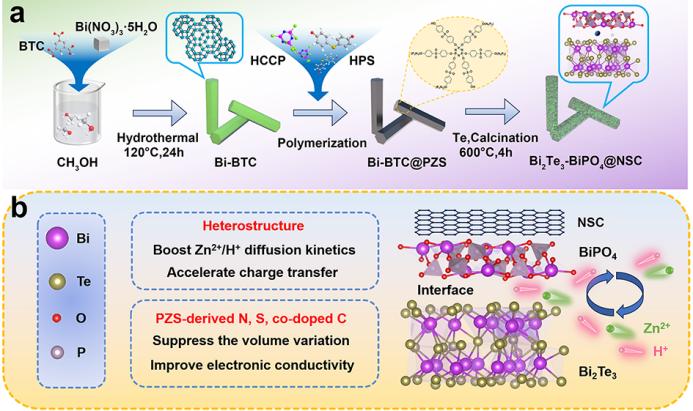 beat365官网此项研究以溶剂热法制备了Bi-1,3,5-苯三羧酸(Bi-BTC)纳米棒,并在Bi-BTC纳米棒上成功地包覆了聚磷腈层(表示为Bi-BTC@PZS),N2气氛中高温碲化得到了N, S共掺杂的多孔碳纳米棒(Bi2Te3-BiPO4@NSC)。通过构建具有内建电场的异质结构,显著增强了电极本征电导率,且多孔结构为Zn2+传输提供了更为高效的通道,有效地缓解了动力学缓慢和结构退化的问题。实验结果和理论计算表明,异质结电极具有较低的带隙,降低了离子扩散阻力。这些调控手段使得Bi2Te3-BiPO4@NSC展现出高可逆容量(0.2 A g-1时为458.2 m Ah g-1)、卓越的倍率性能及优异的循环稳定性。通过引入BiPO4诱导Zn2+和H+的吸附能协同增强,揭示了Zn2+/H+共插层的双离子存储机理。该项研究构筑了一种新型的层状异质结阴材材料,为开发高性能、安全和稳定的锌离子电池提供了一种有前景的解决方案。
