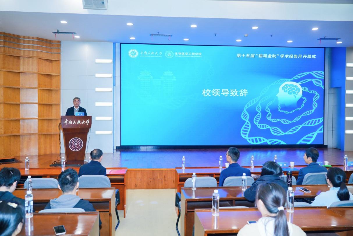 校党委副书记、校长刘义出席开幕式并致辞。他指出,“耕耘金秋”学术报告月是学校推进医工交叉、深化研究生培养、服务国家创新战略的重要平台。生物医学工程作为多学科融合的前沿阵地,在服务“健康中国”建设中具有关键作用。他提出要坚守初心、强化学科根基,把握机遇、对接国家需求,重视青年、搭建成长阶梯三点期望,鼓励师生以医工交叉融合为路径,以服务人民群众大健康事业为己任,在服务国家需求和科学探索的道路上刻苦钻研、不断攀登,努力实现更大价值。
