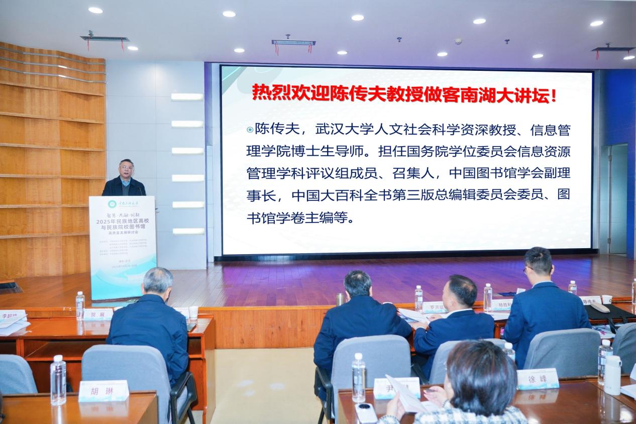 10月29日上午,由图书馆与科学研究发展院共同主办的beat365官网第六十五期南湖大讲坛在学术交流中心举行。武汉大学人文社会科学资深教授、信息管理学院博士生导师陈传夫教授应邀来校,作题为《新型学术生态与图书馆发展》的专题学术报告。图书馆全体馆员及管理学院等单位师生代表聆听了此次报告。