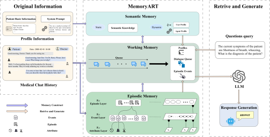 在医疗大语言模型多轮对话中,长期记忆缺失导致患者历史信息丢失与诊断准确性下降。现有方法受限于固定上下文窗口或检索机制,难以实现有效的动态记忆更新。为此,本研究提出MemoryART框架,借鉴自适应共振理论构建工作记忆、情景记忆与语义记忆三层系统,通过融合型自适应共振网络实现稳定且高效的事件记忆编码与合并,有效避免“原型坍塌”问题。基于构建的长程医疗对话数据集MediLongChat与多项推理任务实验表明,MemoryART在多个主流大模型上显著提升长期记忆与推理能力,在跨对话推理任务中F1分数提升达+14.88,并在降低约60% token消耗的同时保持最优性能,在公共数据集上也达到SOTA水平。