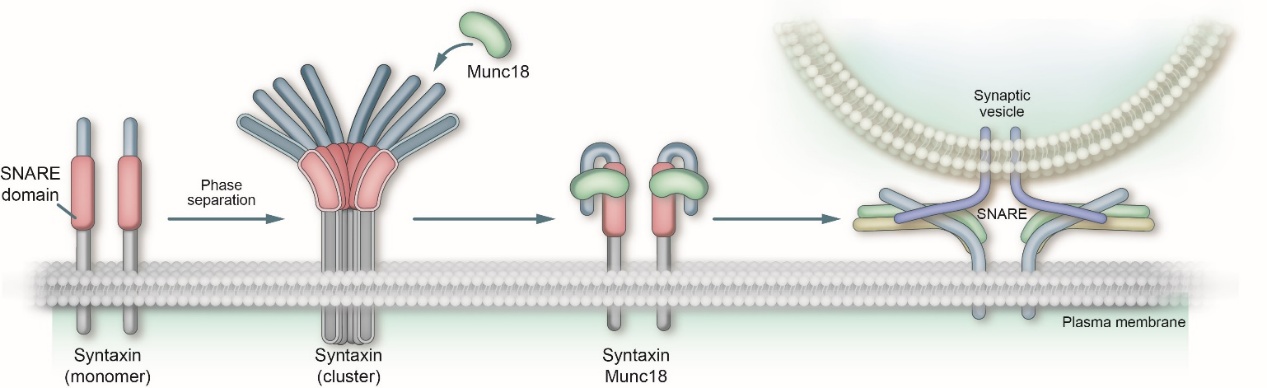 Syntaxin蛋白聚集通过其胞质结构域相互作用驱动相分离而形成,这些聚集结构可作为分子储备库,防止囊泡过度融合。Munc18能够结合并闭合Syntaxin的胞质结构域,将其从蛋白簇中物理分离,从而启动膜融合过程。