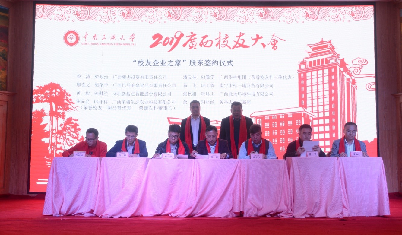大会首先由广西校友会会长黄全胜作广西校友会近年来工作报告。随后,中南民大广西校友企业之家“广西火之舞投资有限责任公司”举行股东签约仪式和会员单位签约仪式,“校友企业之家”正式宣告成立。会上,学校领导、法学院领导、广西校友会领导共同为新成立的广西“校友企业之家”和广西校友会法学分会授牌。