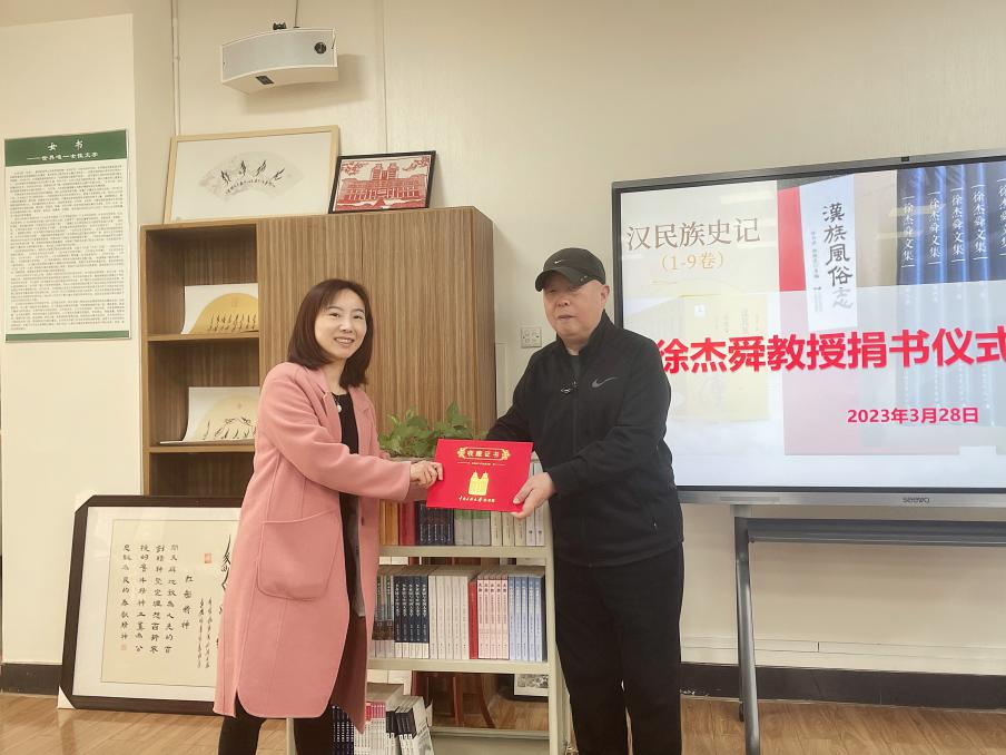 徐杰舜教授共向图书馆捐赠了《汉民族史记》《汉族风俗志》《徐杰舜文集》等图书共计19种82册,大多为其个人著述。图书馆馆长饶映雪代表图书馆接受捐赠并致谢。她向徐教授颁发了收藏证书,表示图书馆一定会利用好这批图书为师生服务,使之发挥应有的作用。