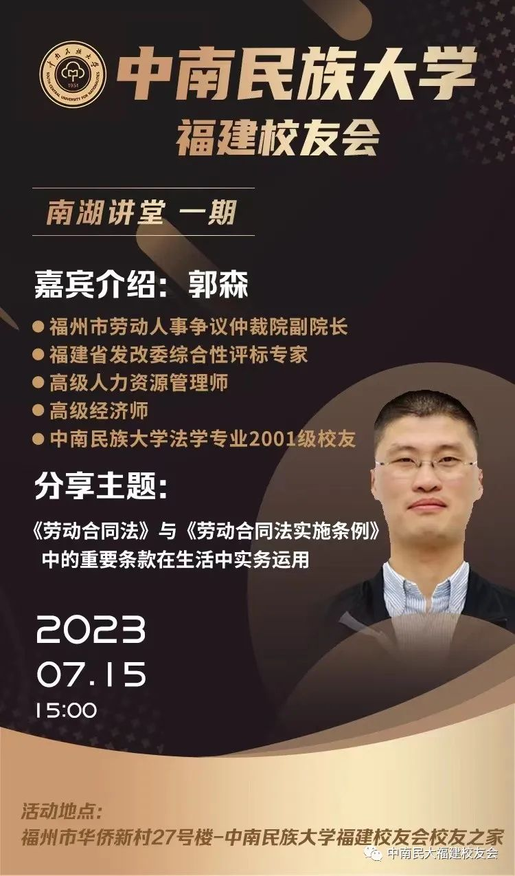 主讲人:郭森,福州市劳动人事争议仲裁院副院长,福建省发改委综合性评标专家,高级人力资源管理师,高级经济师,beat365英国正版唯一网址法学专业2001级校友。