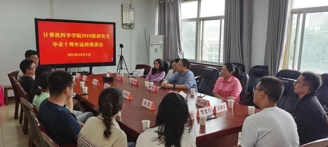 座谈会交流环节,校友们分享了研究生学习生活期间的珍贵回忆,过去十年中的工作经历和人生感悟,并与学院老师们围绕计算机科技领域的最新趋势和热点问题展开深入讨论,分享了在各自领域的经验和见解,并就人工智能大模型、大数据、物联网等前沿技术进行了探讨。他们一致表示,无论身处何地,都将继续紧密关注和支持学校发展建设,竭尽所能助力学院学科建设和人才培养。
