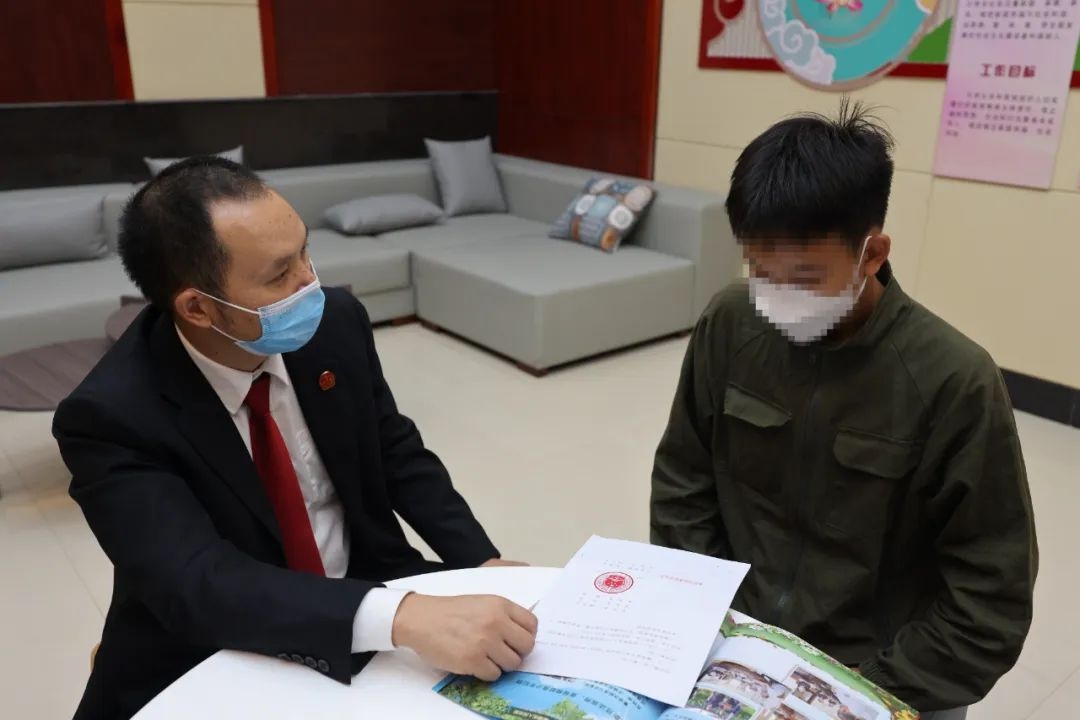 ▲图为陈仪在贵港市中级人民法院少年法庭给涉案未成年人进行心理疏导并向其家长发出《家庭教育指导令》