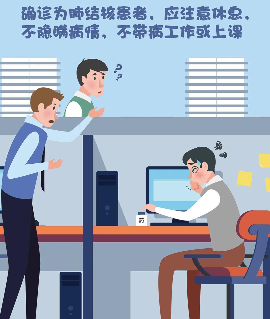 答:在结核病定点医院进一步检查,确诊肺结核后,无需过度恐慌,按照医生要求规则服用抗结核药,接受社区随访,并定期复查。学生患肺结核后应及时告知辅导员或班主任,做好密切接触者的筛查工作,防治结核病疫情的扩散。同时做好个人防护,增强营养,适当运动,提高自身免疫力。