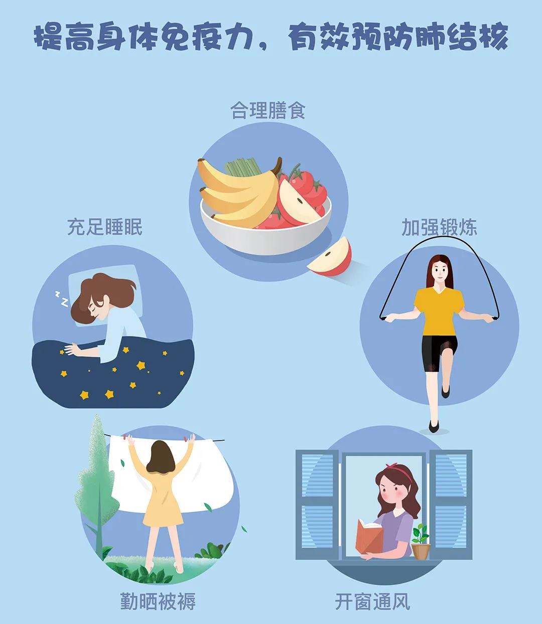 答:当健康人感染结核菌后,1%-2%的人不久后会发病,1/3的感染者成为潜伏感染,一生中的任何时候,只要抵抗力下降就有可能发病。有结核病可疑症状者或肺结核的密切接触者应及时到医院检查。对于大众人群减少发病的方法有:注意生活规律,避免长期过累、精神紧张;注意均衡饮食,以免造成营养不良;加强锻炼,增强体质;改变不良的生活习惯,戒烟限酒,房间勤通风;对高发对象在医务人员指导下进行预防性治疗;新生儿要接种卡介苗。