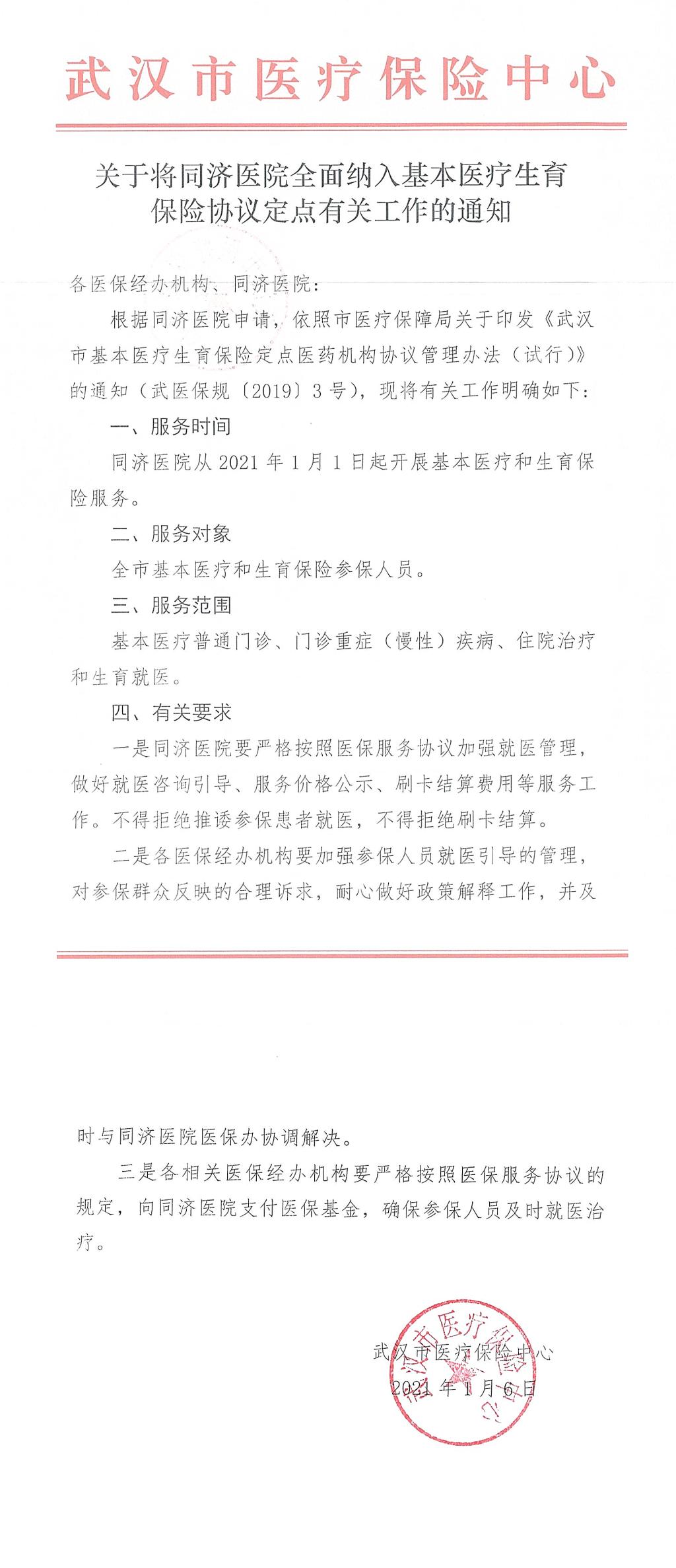 关于将同济医院全面纳入基本医疗生育保险协议定点有关工作的通知