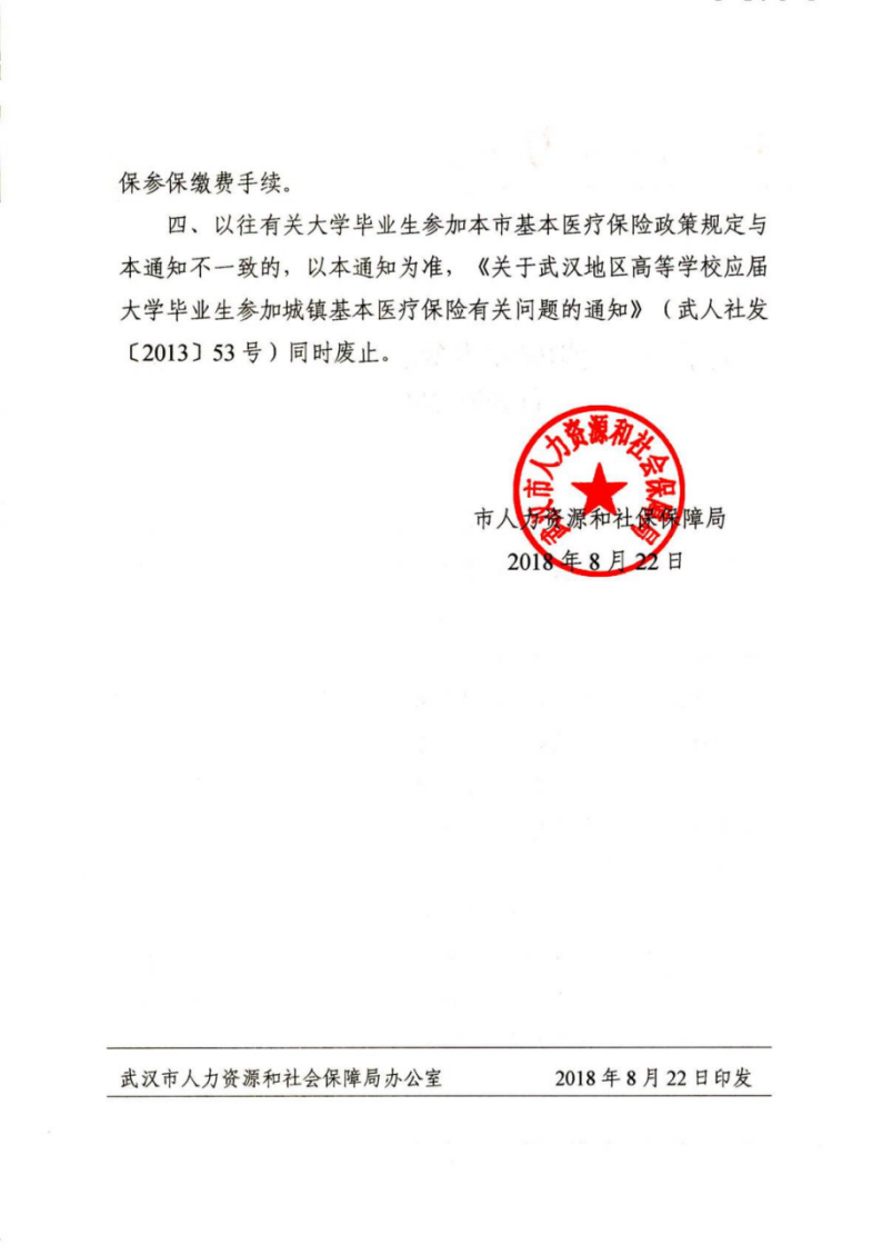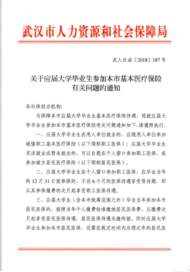 关于应届大学毕业生参加本市基本医疗保险有关问题的通知(武人社函[2018]187号)