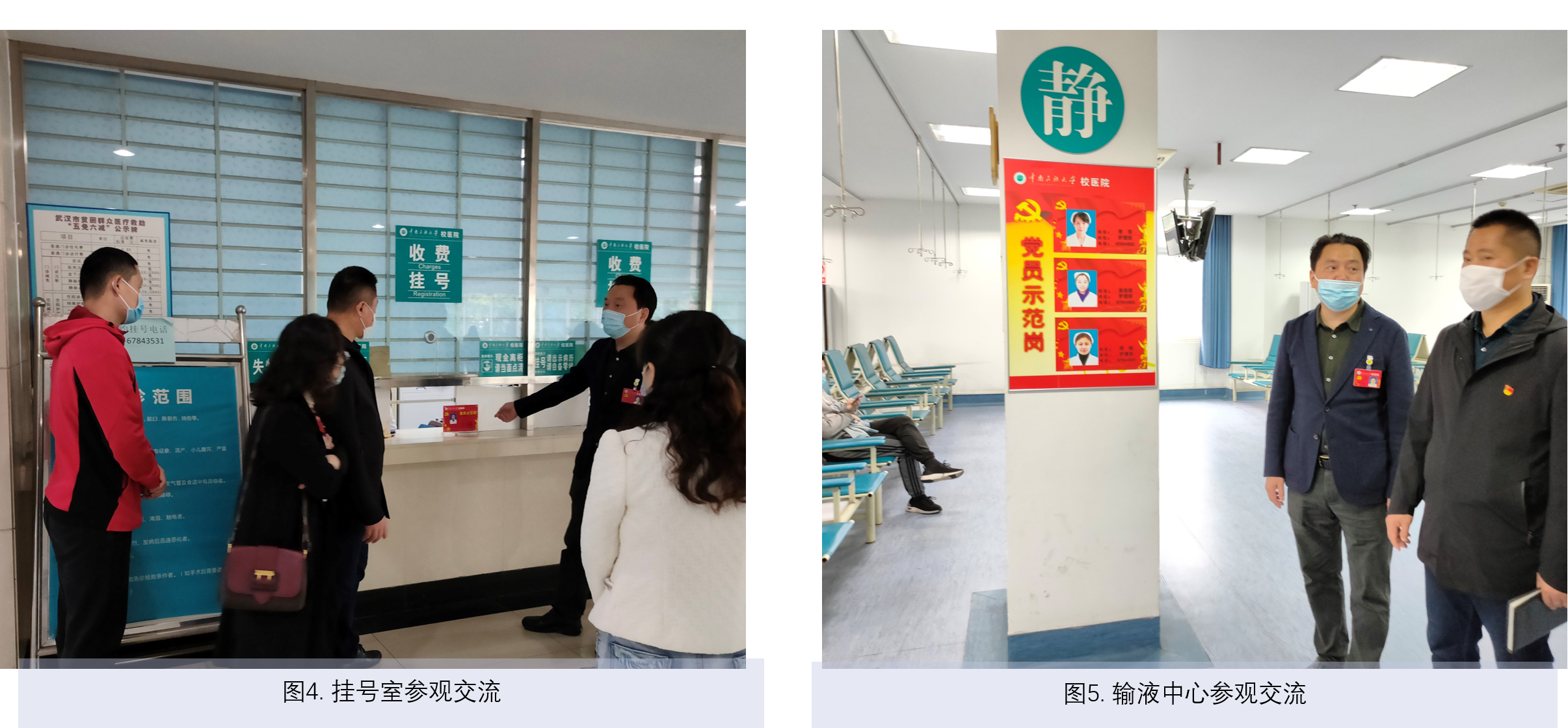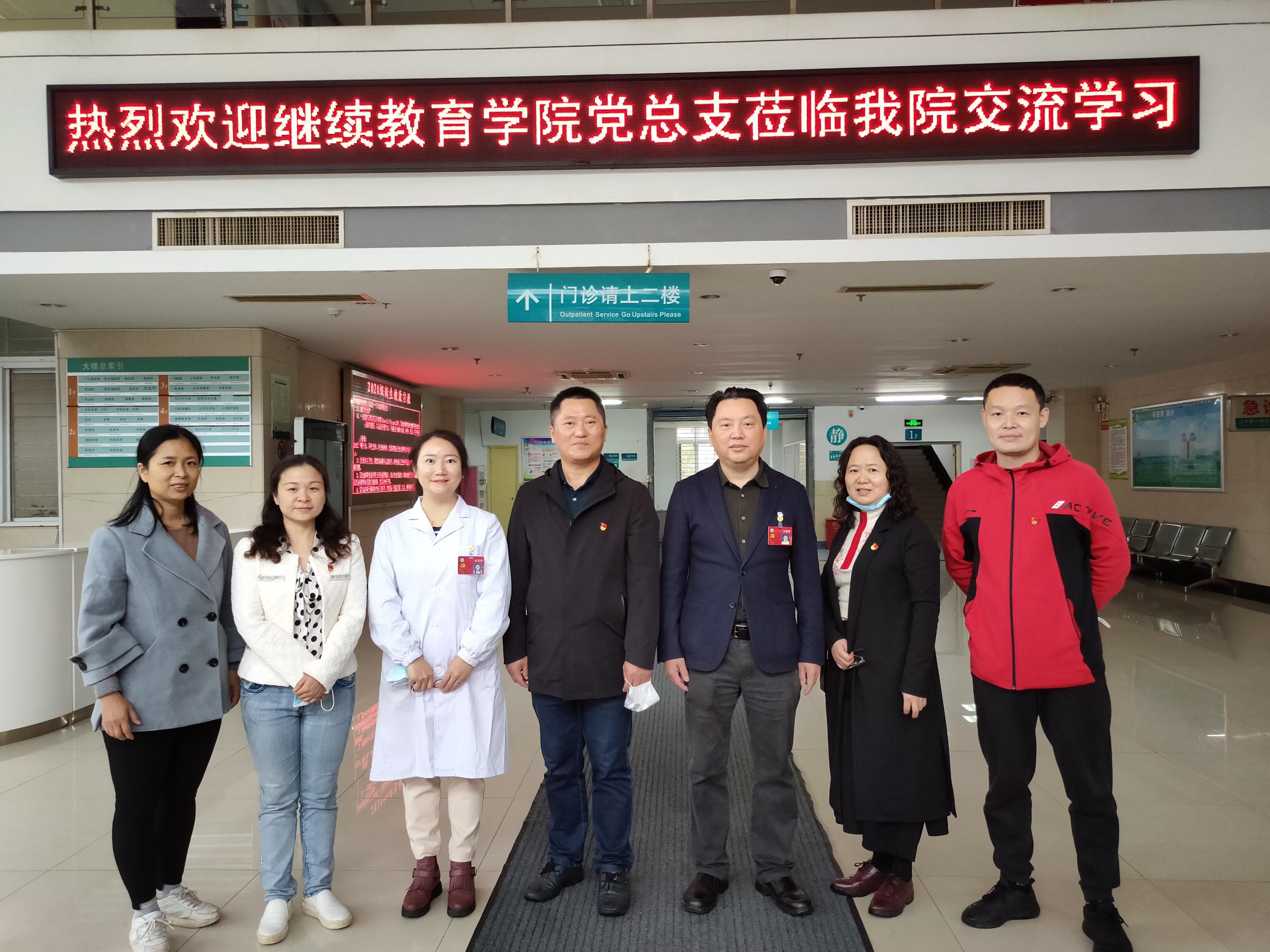 图1. 校医院党总支与继续教育学院党总支开展“联学共建”学习交流活动 当日上午10点,“联学共建”学习交流活动正式开始。继续教育学院党总支书记洪盛志、副院长胡晶晶等一行5人来到我院交流学习,校医院党总支书记钟利和院长龚艳对各位同仁的到来表示热烈欢迎。 活动中,钟利书记就我院党建工作进行简要介绍,并带领继续教育学院同仁参观了解我院整体环境、“党员示范岗”、党建宣传标识以及党建重点科室。随后,公共卫生科党员医师杨冰就校医院党建工作进行专题汇报。