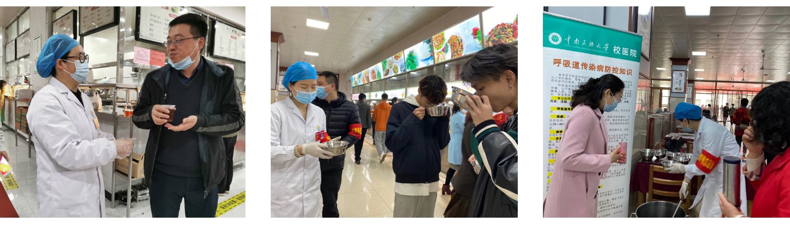 春季天气回暖,是呼吸道传染病的高发季节,学校人群密集,是呼吸道传染病的高发地带。为了普及相关医学知识和技能,提高广大师生的抗病能力,3月17日至19日,校医院组织医护党员到学校八个食堂开展了“预防呼吸道传染病——中药汤剂饮服”活动,免费为全校数万名师生提供“爱心汤药”。