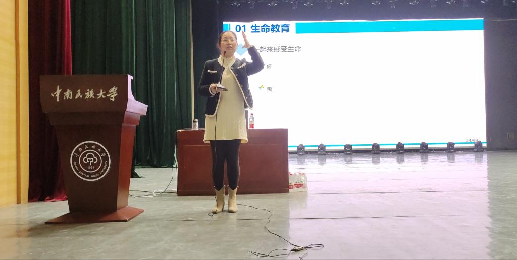 围绕“生命教育”的主题,严玲老师指出:“生命教育是直面生命和人的生死问题的教育”。她以学生求助如何化解宿舍矛盾为例,引导同学们学会释放内在的情绪,认识生命与自我、生命与社会的关系。通过介绍自己名字的由来,分享父母的期望,她鼓励同学们探索和认识生命,唤醒同学们成长的自觉,发现自己的潜能,自觉承担相应的使命。期间,在轻松悠扬的音乐里,她带领大家做深呼吸,与同学们一起在一呼一吸之间聆听内心的呼唤,感受生命的力量和脉动。最后,严玲老师勉励大家对生命心存敬意,与自己和平相处,冷静面对挫折。