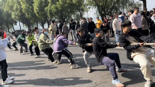 拔河比赛在双子塔前举行。我院学生积极响应活动号召,经过学院体育部筛选,12名同学组建成一支优秀的队伍参与此次拔河比赛。