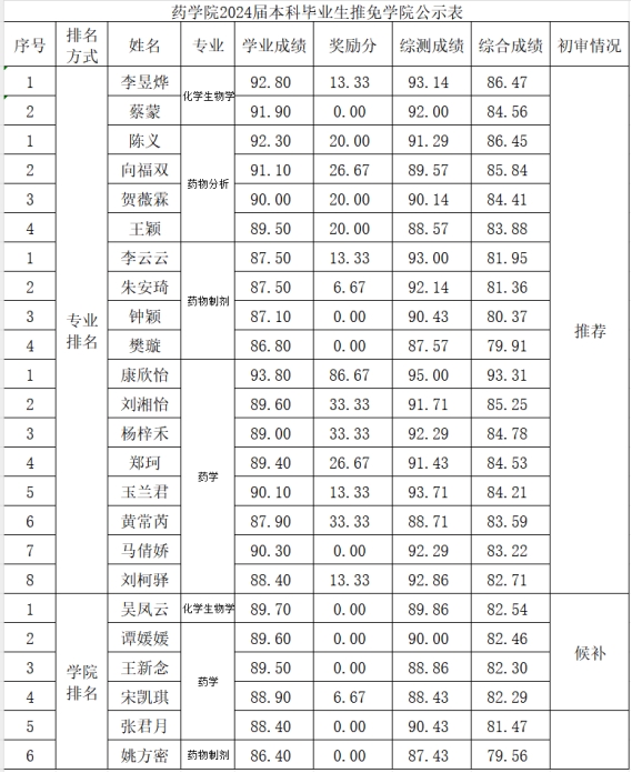 根据《beat365英国正版唯一网址推荐优秀应届本科毕业生免试攻读硕士学位研究生遴选办法(修订)》(民大教学〔2016〕12号)《关于做好推荐2024届优秀本科毕业生免试攻读硕士学位研究生工作的通知》《药学院推荐2024届优秀本科毕业生免试攻读硕士学位研究生工作实施细则》等文件精神,经过报名资格审查、学业成绩核算、奖励加分认定、综合测评考核等环节工作,经研究决定,现将药学院2024届本科生推免结果公示如下: