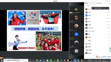 药学1901班线上召开班会,班导师艾洪莲强调同学们要严格按照疫情防控的要求,把安全放在第一位,特别是正处于宿舍隔离阶段的学生,既要注意身体健康和日常防疫,也要做好线上学习。同学们还分享了对冬奥会的关注和观看体会,讲述谷爱凌、苏翊鸣、羽生结弦等运动员的故事,表示要学习运动健儿勇于拼搏的精神,把挑战自我的精神传递给更多人。
