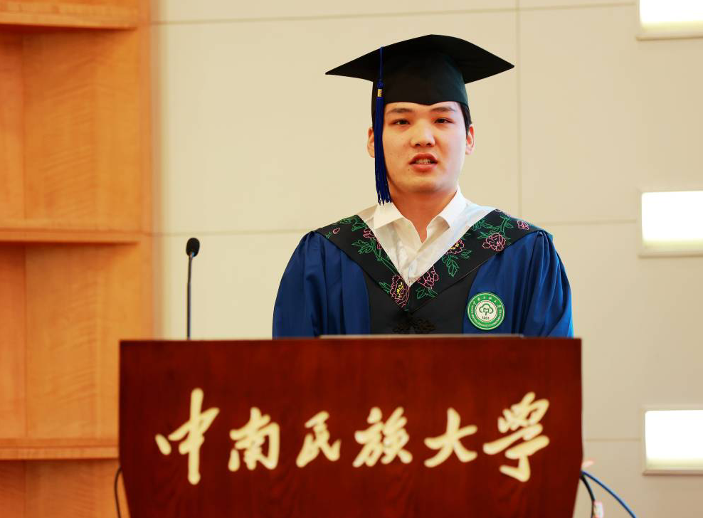 保研至华中科技大学、化学生物学1801班的本科毕业生代表占雨雪在发言中说,在民大学会了坚持自己,学会了勤奋求知,也学着崇尚自然。在发展个性的同时,也学习宽容、博爱,尊重不同差异。在民大药学院的读书求学是终生难忘的经历,面向未来,更需要非凡的勇气:“轻装策马青云路,人生从此驭长风!我们跃入人海,各有风雨灿烂。愿我们在身处时代洪流之时,仍能听从内心的召唤,永远是肩上飞扬有风、心似滚烫火焰的有梦少年,所遇皆良善,所行化坦途”。