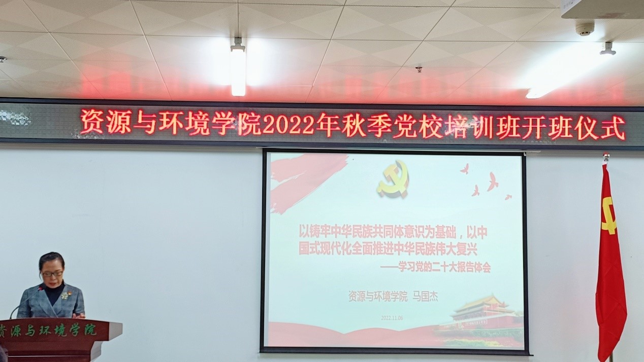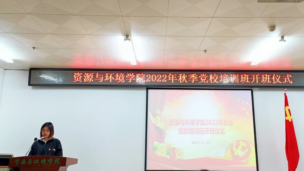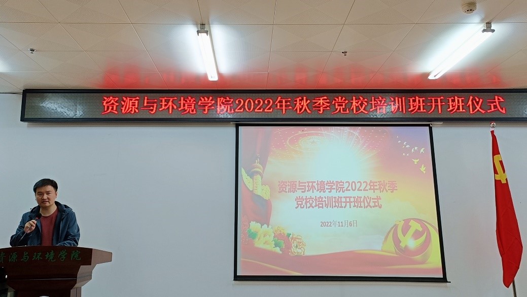 为持续掀起学习宣传贯彻党的二十大精神热潮,全面贯彻习近平新时代中国特色社会主义思想,加强对入党积极分子、发展对象和预备党员的培养和教育,引导青年学生以实际行动积极向党组织靠拢,2022年11月6日晚,资源与环境学院在13号楼261报告厅举行了2022年秋季党校入党积极分子培训班(总第94期)、发展对象培训班(总第13期)、预备党员培训班(总第14期)开班仪式暨第一讲。学院党委书记马国杰、副书记黄本金、党支部书记张俊、党支部书记刘瑾、党校带班老师黄晴和本期党校的全体学员参加了开班仪式。此次开班仪式由党校带班老师黄晴主持。