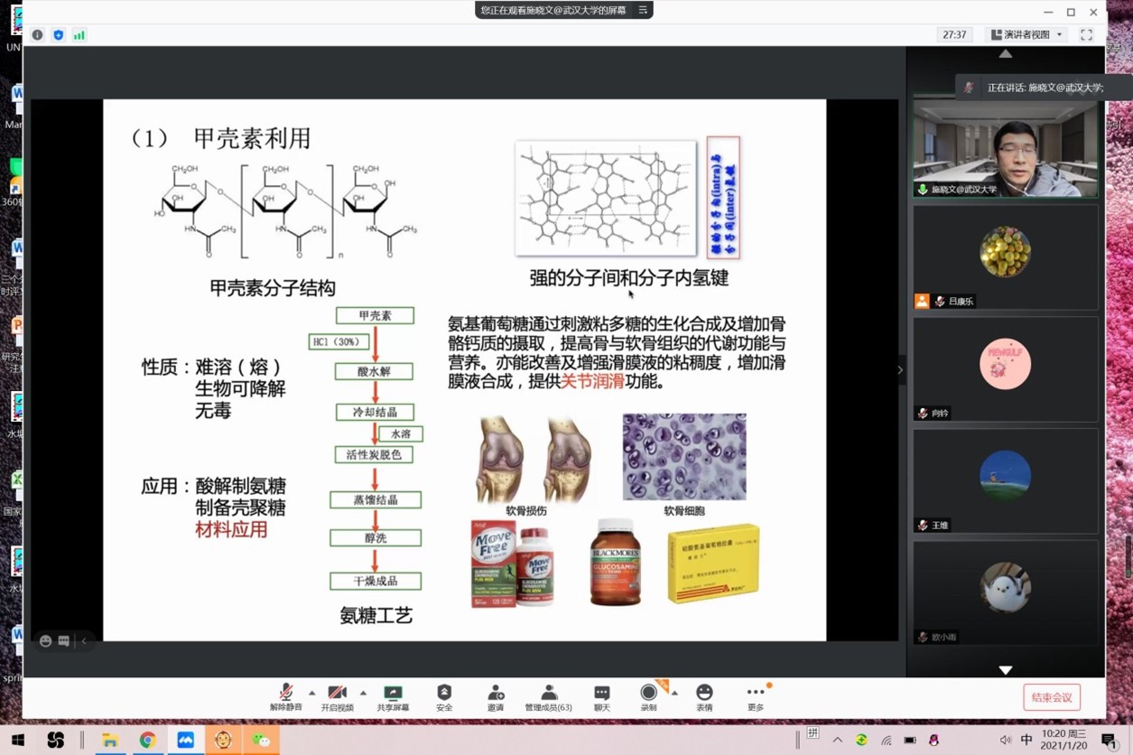 2021年1月20日上午,应我院邀请,武汉大学施晓文教授为我院做题为《甲壳素/壳聚糖资源开发与利用》的线上学术报告。报告由吕康乐教授主持,资环学院和化材学院的60余名师生参加。